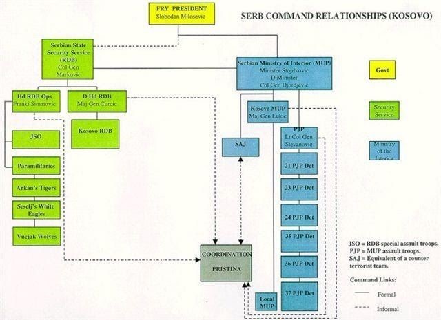 1 Albanian: “patkoi”, serbian: “potkovica”, english: “horseshoe” The regular Serbian-Montenegrin army was under the full control of the High Council of Defence, composed of the presidents of Serbia and Montenegro ("Yugoslavia"). The council was headed and commanded by notorious Serbian President Slobodan Milosevic. During the "Horseshoe" operation, the following military corps were mobilized: 1. Prishtina Military Corpus (Serbian Third Army in Kosovo). It consisted of 5 brigades, 1 military police unit and 1 aviation regiment. Attached to this corpus were the 21st Corpus of Nish, and several other corpuses and military brigades from Serbia and Montenegro. Field composition: - 211th (Nish) Armoured Brigade, consisting of: 1258 troops, 75 tanks, 13 artillery and 4 RBV, - Vranje 150th Brigade, consisting of 1300 troops, 72 artillery and 12 RBV, - 78th Vranje Motorized Brigade, consisting of 1316 troops and 31 tanks, - 2nd Nish Brigade, consisting of 1600 troops and 10 tanks, - 175th Leskovac Brigade, consisting of 1600 troops and 18 tanks, - Pirot's 4th Motorized Brigade, consisting of 1600 troops, 31 tanks and 18 artillery pieces, - Prokuplje Engineering Unit 352 with 1000 troops each, - Nish Logistics Unit 85, consisting of 1000 troops. 2. The 37th Corps of Uzhica, with the 37th Motorized Brigade of Rashka consisting of 1695 troops, 31 tanks and 18 cannons, the 19th Pozhega Brigade, with 1600 troops and 18 cannons. 3. 24th Kragujevac Corpus: Kragujevac 80th Brigade with 1600 troops, and 18 cannons. Novi Sad's 12th Corpus, with: Novi Sad's 18th Brigade with 1,600 troops, and 18 cannons. Belgrade First Army , consisting of :252nd Kralevo Brigade with 1121 troops, 82 tanks, 12 cannons and 4 RBVs. 4. The Belgrade Special Corpus consisting of: The first Armoured Brigade, consisting of: 1184 troops, 112 tanks, 12 artillery and 4 RBV, 72nd Special Brigade, with 1189 troops, 63rd Parachute Brigade, with 460 troops. 5. Corps 2 of Podgorica, which included: - 5th Motorized Brigade, with: 1478 troops and 31 tanks, - 1 B / 4 Alpine Brigade of Kollashin, with: 350 troops, - 4th Brigade of the Podgorica Military Police, with: 359 troops. In addition to the regular military forces, the structures of the Ministry of Internal Affairs of Serbia, as well as other special and paramilitary units are involved in the implementation of the "Horseshoe" plan. The Ministry of Internal Affairs of Serbia2 was headed by Minister Vlajko Stojilkovic.. Ministry of Internal Affairs of Serbia included : - Kosovo regular police, commanded by Sreten Lukic. - Special police forces, 3 commanded by Lieutenant General Obrad Stevanovic. - Anti-terrorist forces, 4 which were commanded by Colonel Zivko Trajkovic, - And from the Commander of the Public Security Sector in the Ministry of Internal Affairs, General Vlastimir Djordjevic. Within the other security organs, the secret security service, the State Internal Security (Serbian: “UDB”), also operated. The head of state security during the war in Kosovo was David Gajic. During the war, the State Security Service was tasked with organizing and overseeing of the operational activities of the notorious paramilitary units in the background: